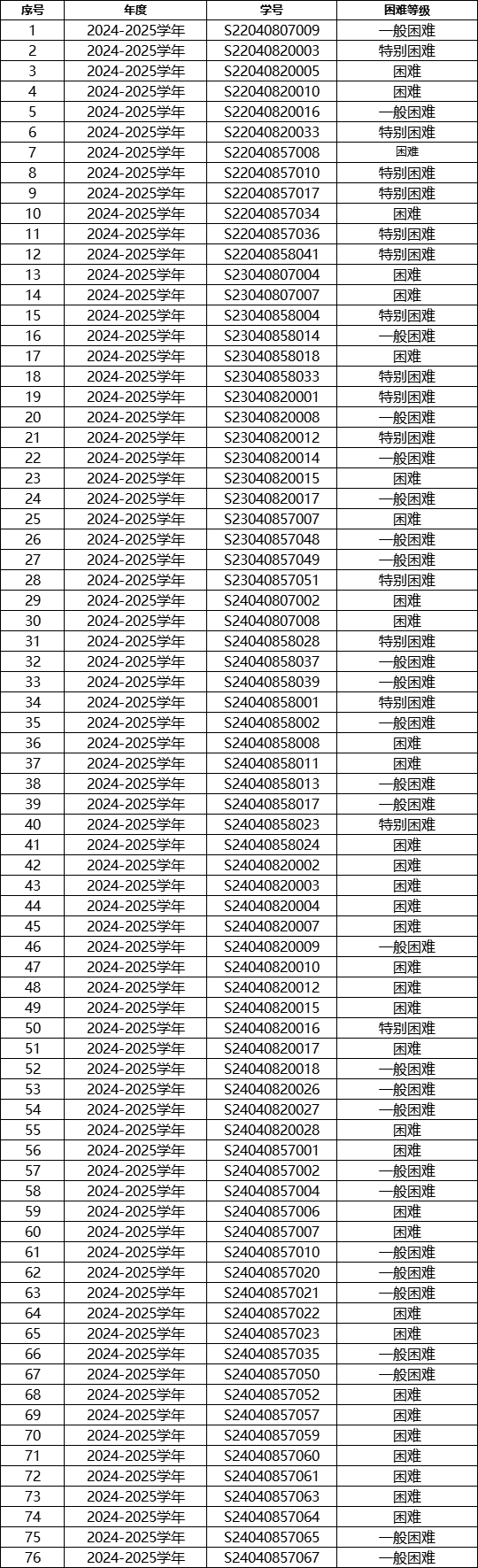 根据《教育部等六部门关于做好家庭经济困难学生认定工作的指导意见》(教财〔2018〕16号)、《省教育厅等六部门关于印发<江苏省家庭经济困难学生认定工作实施办法>的通知》(苏教助〔2019〕1号)和《省教育厅等五部门关于进一步健全精准资助部门协同工作机制的通知》(苏教助函〔2022〕6号)的精神,按照《常州大学家庭经济困难学生认定工作实施办法》(常大〔2019〕213号),经过学生本人申请,班级家庭困难学生认定评议小组评议,学院认定工作小组审核,现将 2024 -2025学年研究生家庭经济困难等级认定结果公示如下: