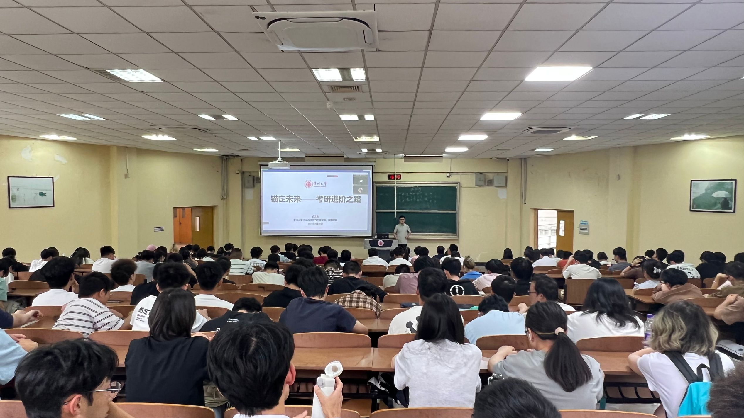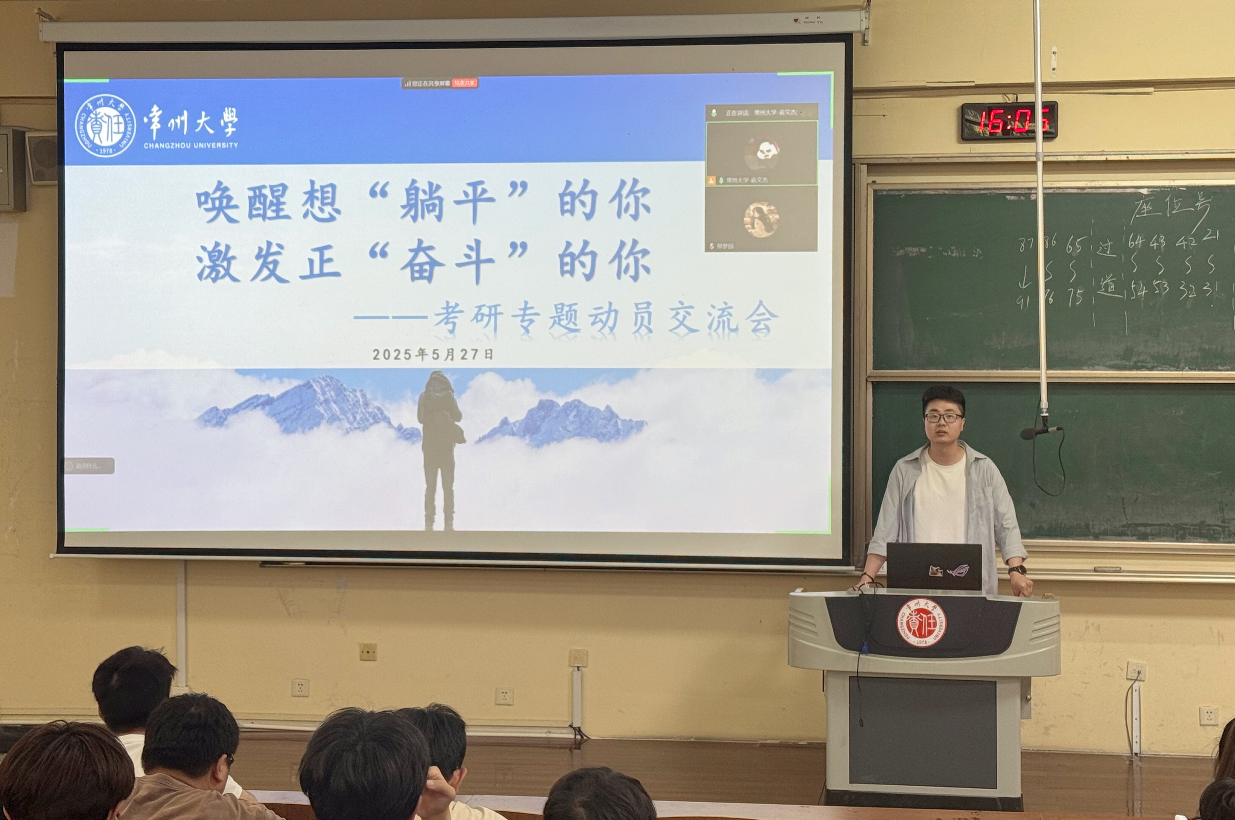 会上,张健首先详尽分析了年级学风学情情况,并就目前存在的问题进行了教育引导,接着,他结合学院近几年本科毕业生考研情况,从考研是什么、要不要考研、如何科学报考等方面,重点宣讲了考研基本知识与报考流程,分析了当前考研形势和未来就业前景,介绍了研究生教育对个人成长和社会发展的重要意义,帮助同学们进行精准定位,针对备考中可能遇到的困难,提供了具体建议和指导,他鼓励同学们坚定信心,勇敢踏上考研征程,积极迎接考研挑战,为实现自己的考研梦想而努力奋斗。最后,在考研经验交流环节,本、硕、博阶段均在常大求学的俞文杰结合自身考研经历,以亲身体会向同学们分享了他对考研的认识,考研是一场持久战,他建议同学们要合理安排考研复习时间,坚持不懈,踏实学习,用切实的行动力寻求施展个人才能的更大空间。