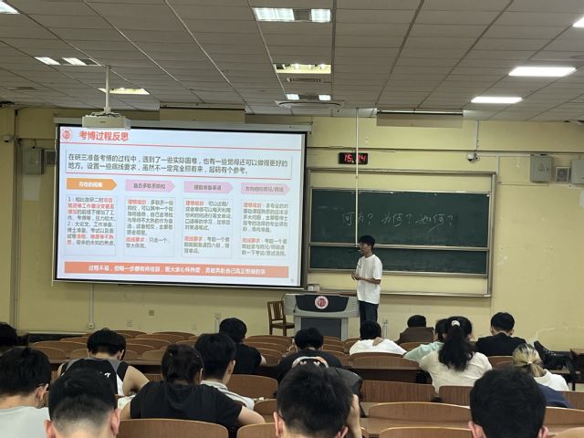 分享会上,朱宝忠教授以“如何读研究生”为题,结合自身多年的学术研究与指导经验,从科研方法、学术素养和时间管理等方面进行了深入浅出的讲解,为同学们提供了宝贵的学术成长建议。随后,三位就业先进代表从职业规划、求职准备、行业趋势等角度出发,为即将步入职场的同学提供了实用指导;三位考博先进代表则分享了备考策略、院校选择及面试技巧,助力有志于深造的同学明晰方向。